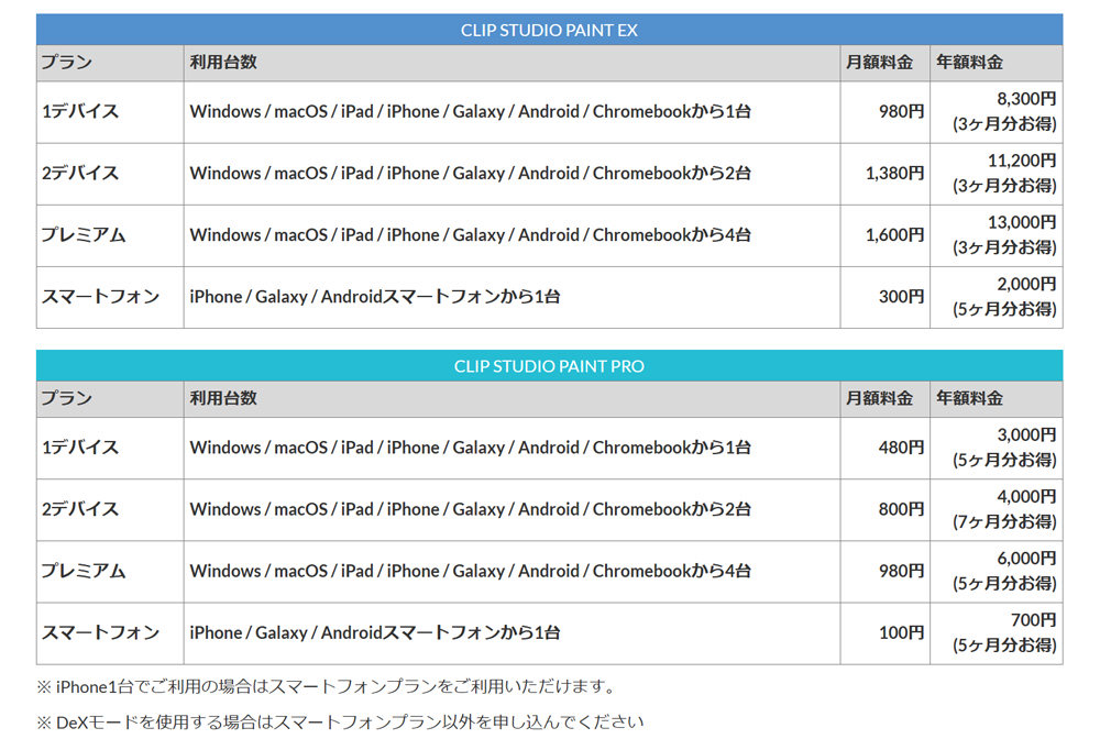 クリップスタジオペイントPROとEXそれぞれの仕様、値段の違い